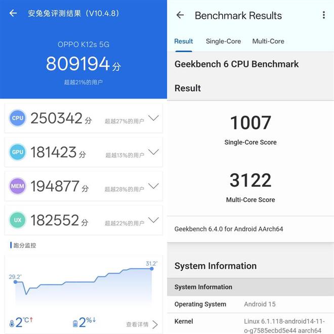 GeekBench 6单项性能测试中,OPPO K12s单核性能1007分,多核性能3122分,相比骁龙7s Gen3略弱一点。