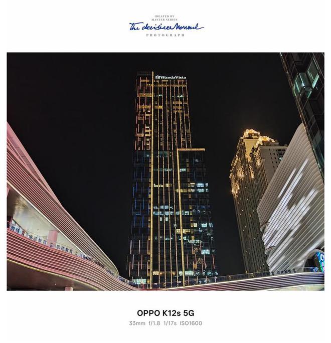 在夜间场景下,OPPO K12s通过夜景模式拉高曝光,能够很好地平衡光线和色彩,使得建筑物的轮廓和细节清晰可见,同时保留了灯光的色彩和夜间的氛围感。