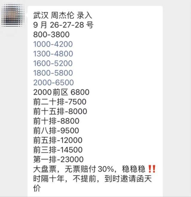 更让人惊讶的是,在黄牛发送的消息中,周杰伦武汉演唱会连前排价格都做了标注——第一排售价高达23000元,前三排价格高达14500元!