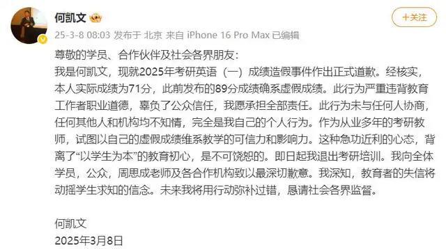 3月8日,何凯文在微博发文致歉,称实际成绩为71分,此前发布的89分成绩确系虚假成绩,并表示即日起退出考研培训。