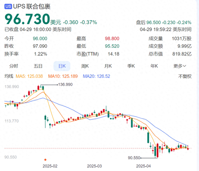 股价方面,自特朗普上任以来,联合包裹的股价已跌超25%,而自4月2日特朗普宣布所谓“对等关税”政策以来跌超12%。