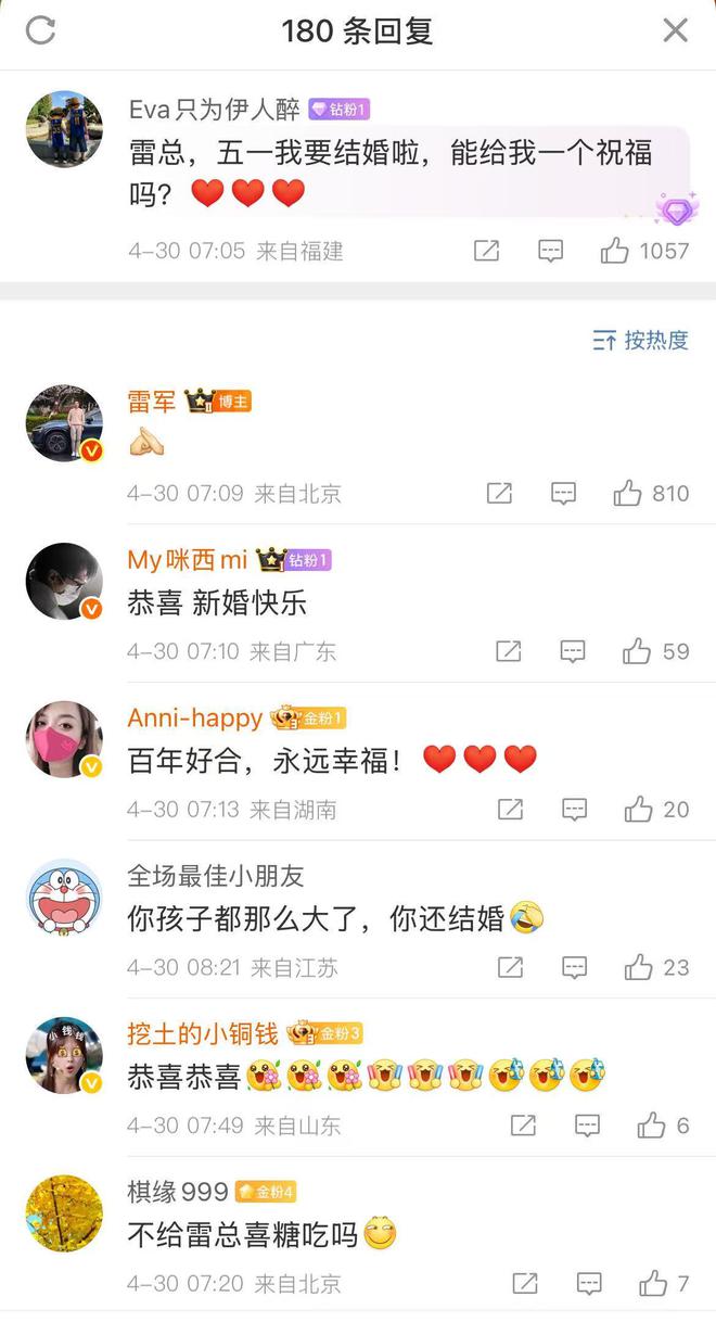 雷军为五一结婚网友送上祝福 访客 2025-04-30 16:13:09 84073 抢沙发 默认 今日,雷军发文问网友的五一假期计划,有网友留言称:“雷总,五一我要结婚啦,能给我一个祝福吗?”雷军表情回复祝福,网友也纷纷发来祝福。 标签: 网友 我要 海报 阅读 QQ 分享 微博分享 微信分享 分享 上一篇李开复出任福建福耀科技大学理事会理事 下一篇曹操出行更新招股书:2024年营收147亿,同比增长37.4% 李开复出任福建福耀科技大学理事会理事上一篇 曹操出行更新招股书:2024年营收147亿,同比增长37.4%下一篇 相关推荐 网友我要 全红婵新疆滑雪惊艳亮相,萌态十足! 2025-11-26 打工人崩溃瞬间,无法发放与访问,系统突发故障 2025-11-17 四姑娘山男子反向穿越失联,发现时已无生命体征 2025-10-31 四姑娘山男子反向穿越失联,发现时已无生命体征 2025-10-31 28岁男演员被曝被关看守所,等待审判 2025-10-17 紫辉创投郑刚,罗永浩与西贝的软柿子之争 2025-09-13 陈奕迅现场辟谣“开卡车撞飞伍佰”:真的不是,但的确很像,我这种脸满街都是 2025-08-18 继“飞机拜拜员”后,上海一机场“箱子垫垫员”走红 2025-08-17 发表评论取消回复 快捷回复: 评论列表 (暂无评论,84073人围观)参与讨论 还没有评论,来说两句吧...