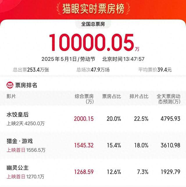 2025五一档首日电影票房破亿 访客 2025-05-01 15:26:52 53000 抢沙发 默认 据网络平台数据,截至5月1日13时47分,2025年五一劳动节票房破亿,《水饺皇后》领跑劳动节票房榜。 标签: 劳动节 水饺 海报 阅读 QQ 分享 微博分享 微信分享 分享 上一篇经常吃馒头VS经常吃面包,哪个更健康?一文了解→ 下一篇别跑空!洛阳这些博物馆预约已满! 经常吃馒头VS经常吃面包,哪个更健康?一文了解→上一篇 别跑空!洛阳这些博物馆预约已满!下一篇 相关推荐 劳动节水饺 “马丽说不再与沈腾合作”?本人最新回应 2025-05-05 《水饺皇后》票房暂列“五一档”第一,口碑两极分化,马丽路演感谢沈腾:他是我的恩人 2025-05-01 发表评论取消回复 快捷回复: 评论列表 (暂无评论,53000人围观)参与讨论 还没有评论,来说两句吧...