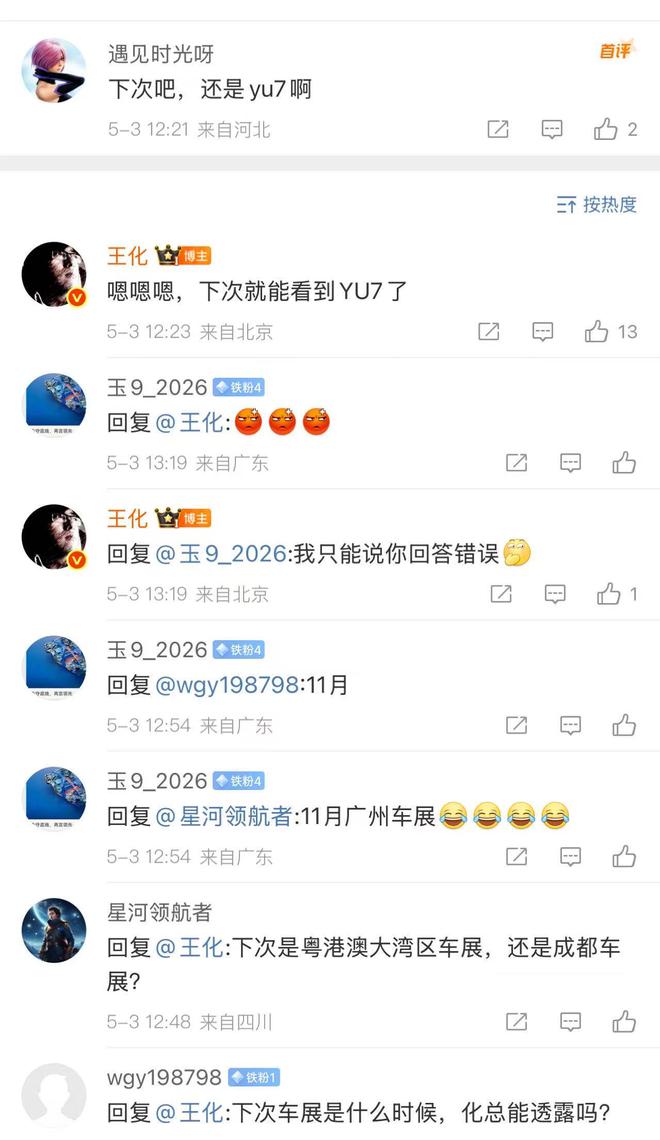 在评论区,王化称“下次就能看到YU7了。”