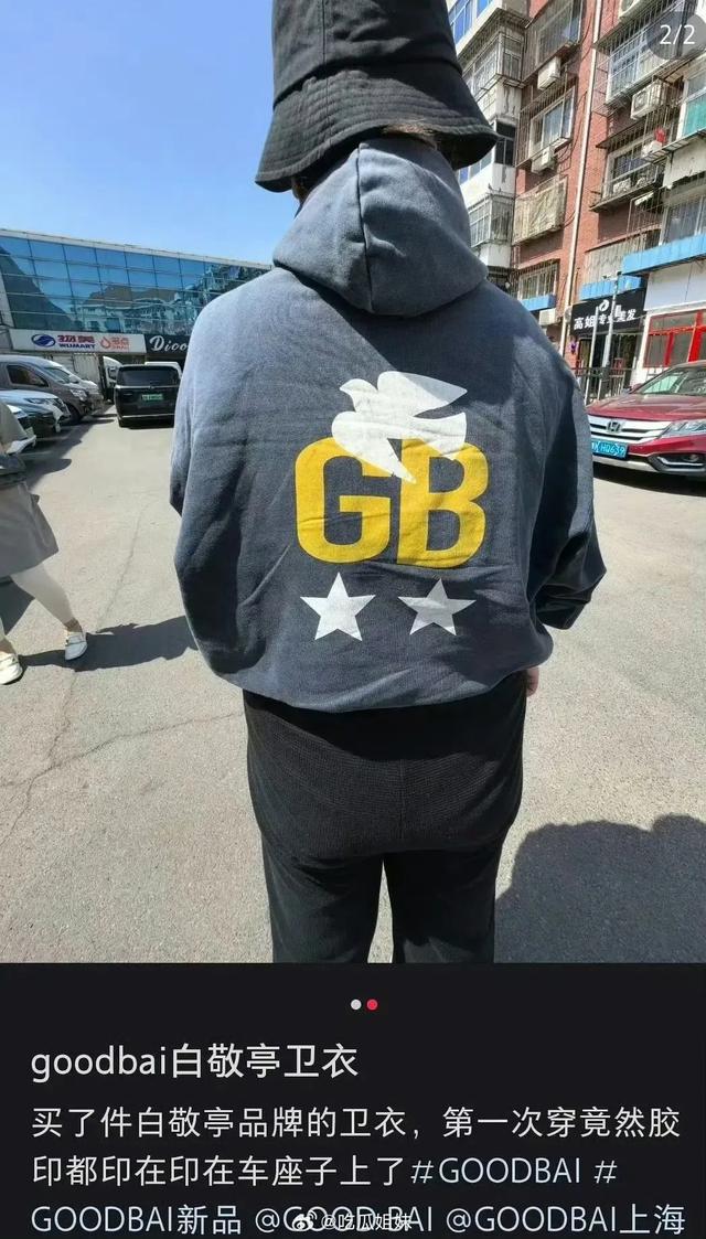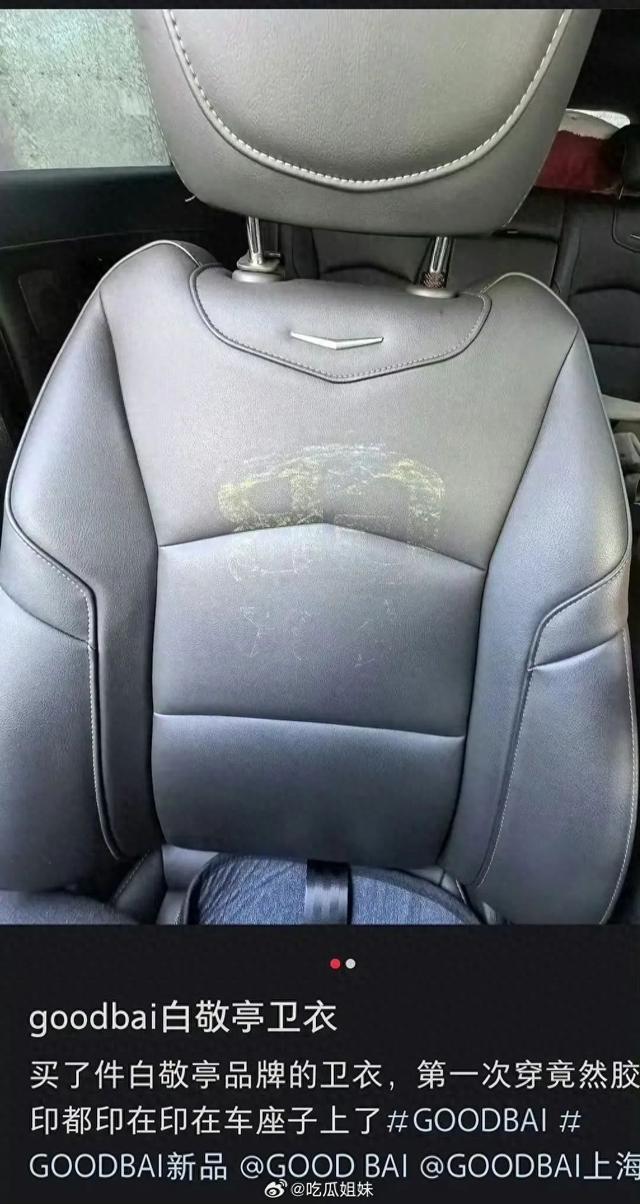 网友发布的几张图片显示,他购买的是GOODBAI GB星星白鸽logo印花连帽卫衣。另一张图片里,车辆座椅上赫然残留着卫衣背面的“GB”标识印痕。该事件引发网友热议,评论区有网友也表示,同系列卫衣存在褪色问题。