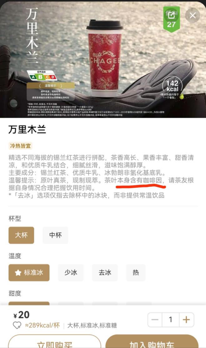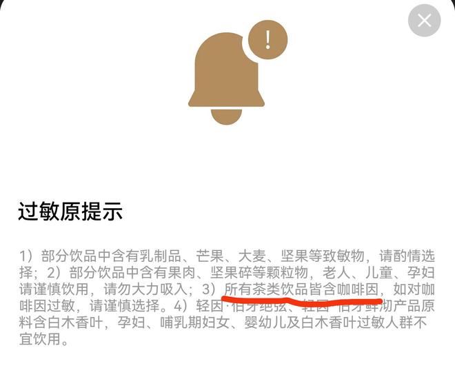 三言注意到,霸王茶姬小程序中,并没有在每种饮品的点单页面里详细列出咖啡因含量,仅警示用户所有茶类饮品中皆含有咖啡因。