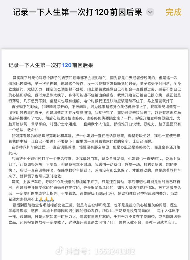 这名网友在评论区进一步解释称,自己平时喝奶茶和咖啡没有问题,但这次在半夜首次喝后,出现身体不适,包括全身无力、心跳微弱、呼吸困难等。之后在躺下时感觉心跳要停止,看到黑色影子,意识到情况危急,于是拨打120。