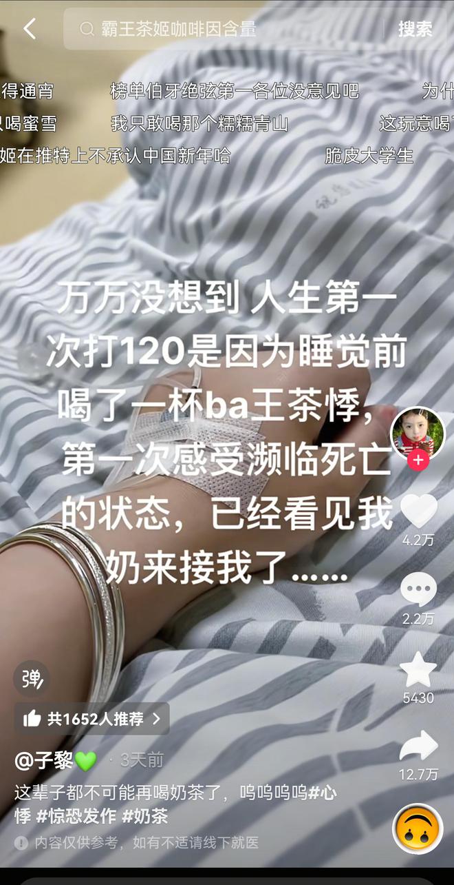 该网友称自己万万没想到人生中第一次拨打120是因为喝了一杯霸王茶姬。
