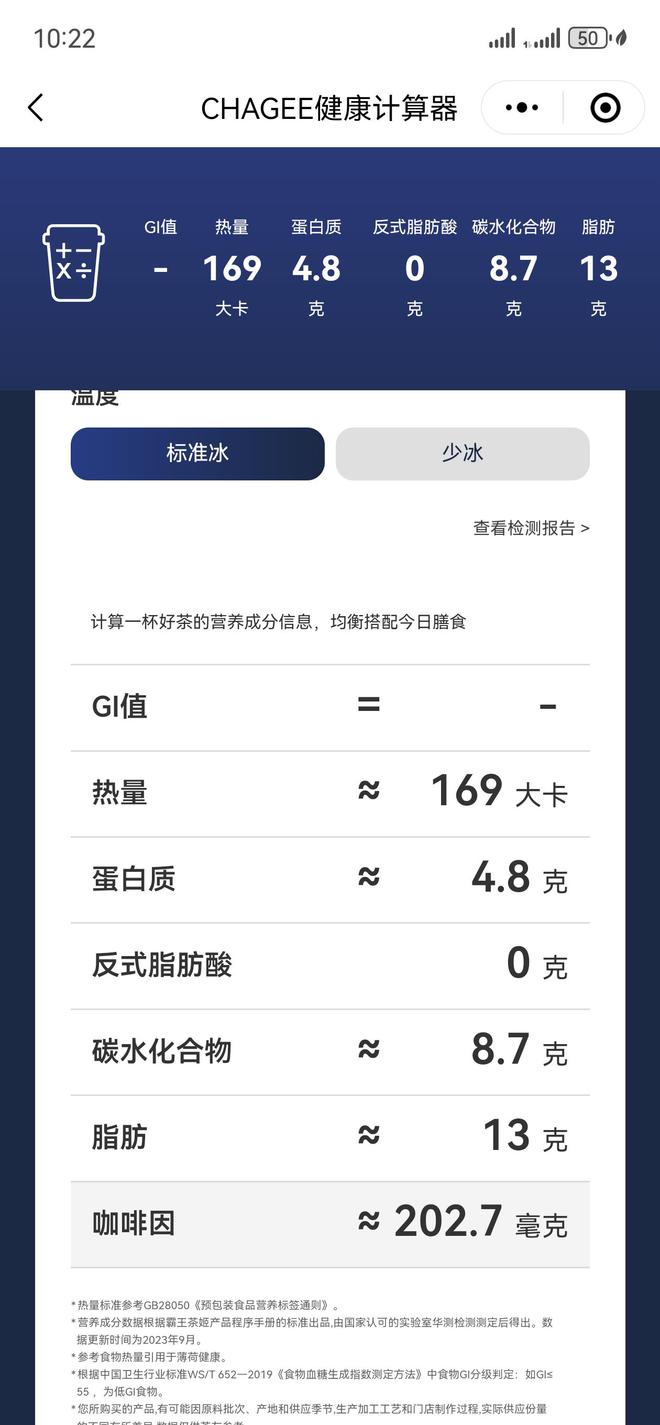 如需查看具体咖啡因含量,需要在霸王茶姬小程序首页侧滑菜单中“健康计算器”查看。三言测试发现,霸王茶姬的大杯“万象春和”饮品约640毫升,咖啡因含量可达约202.7毫克。作为对比,一罐250毫升的红牛含有80毫克咖啡因;一杯350毫升的冰美式咖啡因含量在136至226毫克。