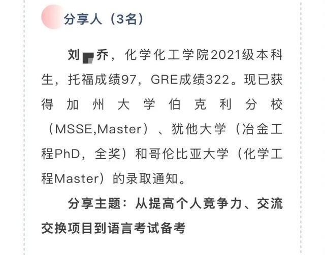 此外,根据重庆大学此前发布的一则讲座信息介绍,刘某乔此前取得托福97分、GRE322分的成绩,现已获得加州大学伯克利分校、哥伦比亚大学等学校的录取通知。