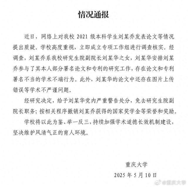 今天(5月10日),重庆大学发布情况通报称,学校成立专项工作组进行调查核实。经调查,刘某乔系该校研究生院副院长刘某华之女,刘某华安排刘某乔参与了其本人部分署名论文和专利的研究工作,存在论文和专利署名不当的学术不端行为。此外,刘某华的论文中还存在图片上传错误等学术不严谨问题。