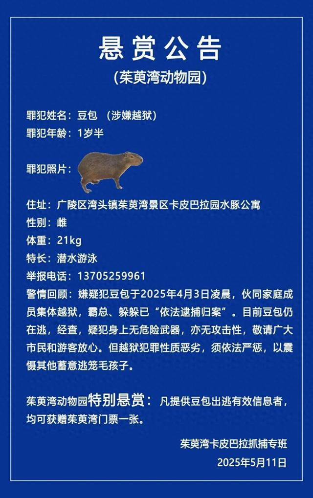 5月11日上午,江苏省扬州市茱萸湾风景区管理处在其官方微信公众号发布一则悬赏公告,称茱萸湾动物园的卡皮巴拉豆包于2025年4月3日出逃,至今已达40天。