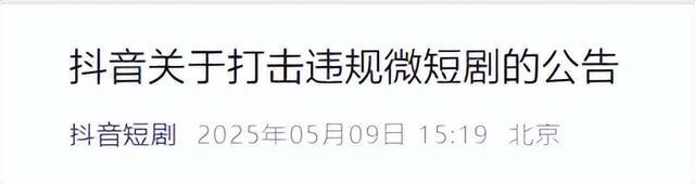 5月9日,“抖音短剧”公众号发布《抖音关于打击违规微短剧的公告》称,4月,抖音平台累计拦截下架违规微短剧223部,大量在审核阶段进行了拦截未上线播放,部分为回查下架。