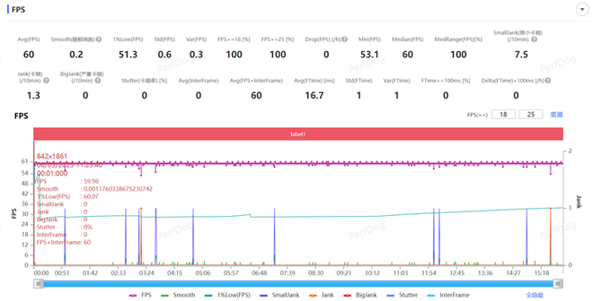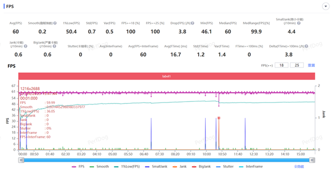 接着我们测试了高负载的《崩坏:星穹铁道》手游,在最高画质+60帧模式下,星槎海中枢跑图测试15分钟,游戏的平均帧率依然稳定60FPS,平均波动0.2,测试期间没有丝毫掉帧、卡顿出现,高负载游戏表现非常可观。