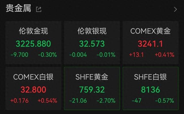 Wind数据显示,12日晚间,国际贵金属期货普遍收跌,COMEX黄金期货跌3.06%报3241.80美元/盎司,现货黄金跌近3%,跌破3250美元关口。13日早间,二者均有小幅波动,截至发稿,现货黄金跌0.3%,报3225.880美元/盎司,COMEX黄金期货涨0.41%,报3241.1美元/盎司。