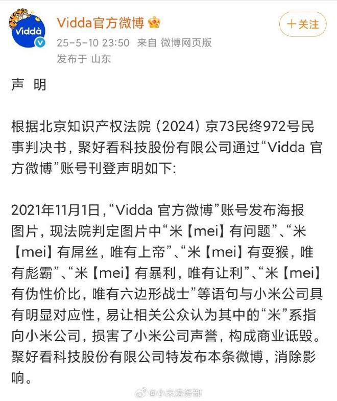 今日,小米法务部发文称关于小米起诉聚好看科技股份有限公司商业诋毁一案,近日小米收到法院终审判决,驳回聚好看公司的上诉,维持原判。