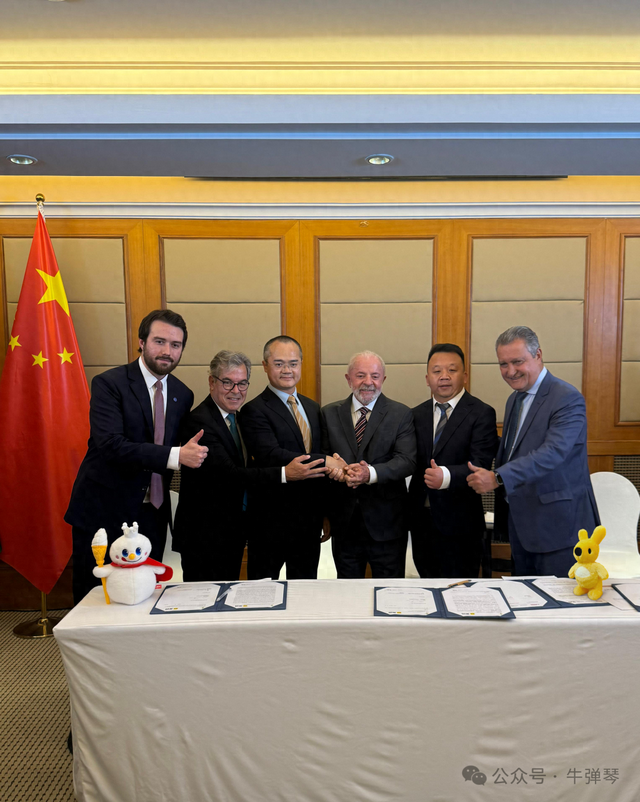 【巴西总统卢拉(右三)与美团公司创始人、CEO王兴(左三)会面,并见证签署投资协议】