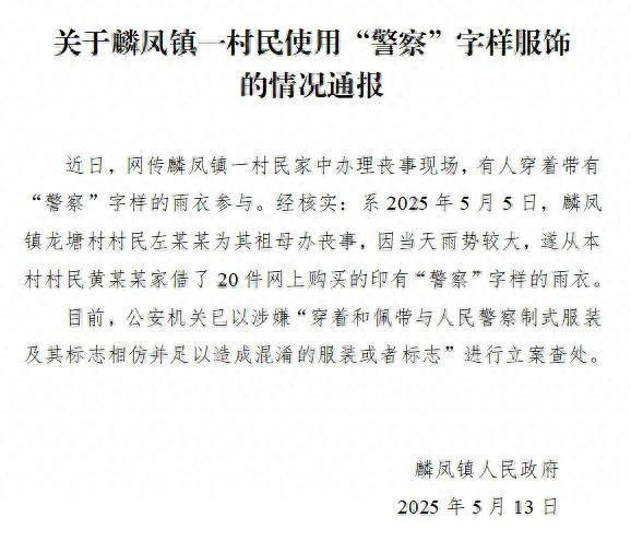 据云南省威信县麟凤镇人民政府微信公众号消息,麟凤镇人民政府13日发布情况通报称,近日,网传麟凤镇一村民家中办理丧事现场,有人穿着带有“警察”字样的雨衣参与。经核实:系2025年5月5日,麟凤镇龙塘村村民左某某为其祖母办丧事,因当天雨势较大,遂从本村村民黄某某家借了20件网上购买的印有“警察”字样的雨衣。