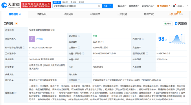 天眼查App显示,近日,安徽奇瑞智能科技有限公司成立,法定代表人为尹同跃,注册资本12.8亿人民币,经营范围包括汽车零部件研发、汽车零部件及配件制造、汽车零配件批发、供应链管理服务等。股东信息显示,该公司由奇瑞控股集团有限公司全资持股。