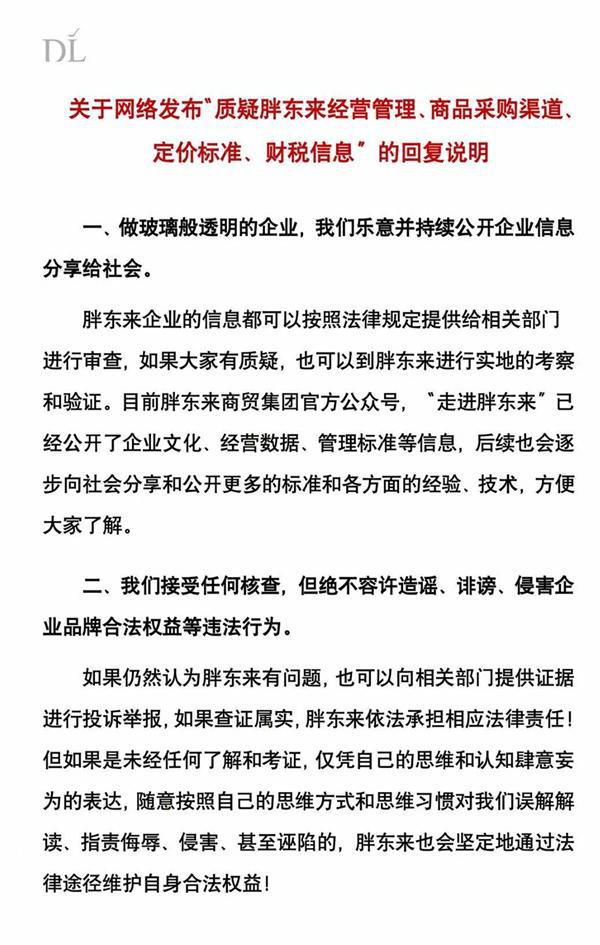 其中提到,胖东来企业的信息都可以按照法律规定提供给相关部门进行审查,如果大家有质疑,也可以到胖东来进行实地的考察和验证。