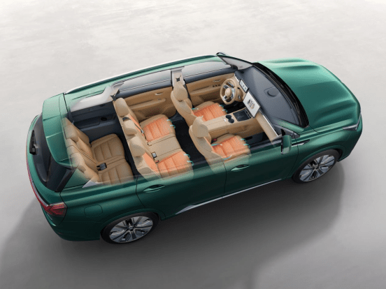 新车采用封闭式前脸+贯穿式LED日行灯,搭配梯形散热口和导流槽设计,强化新能源特征与运动感。侧面采用平直腰线+19英寸轮毂,车身尺寸为4760×1865×1710mm,轴距2785mm,提供5/7座灵活布局,二排腿部空间达885mm,三排放倒后后备厢容积可扩展至1694L。