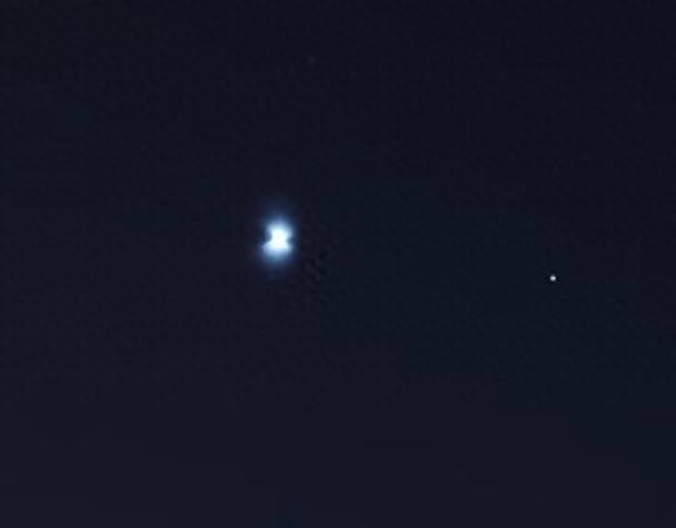 “起初以为是月亮,细细的,亮度也差不多,但后来变形了,中间一个圆点,上下呈现扇子形状。”@xerman描述,他和同行人在22点55分发现这个发光体,从56分开始用手机拍摄,“我们还开车追了会儿,但没追上,它加速飞走了。”
