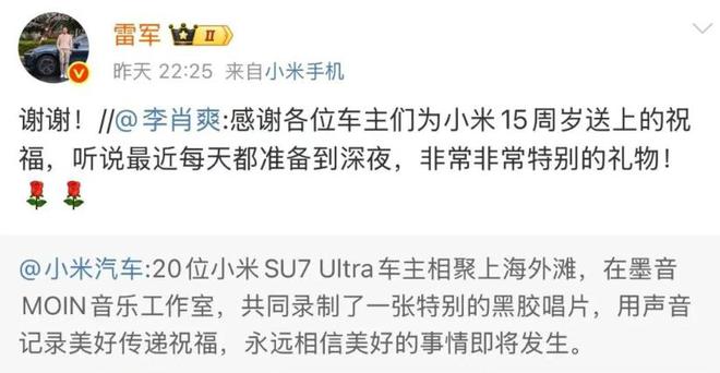 20位小米SU7 Ultra车主为小米15周年录唱片,雷军表示感谢