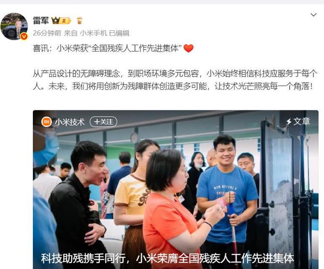 雷军:小米获全国残疾人工作先进集体 访客 2025-05-18 15:51:40 51852 抢沙发 默认 雷军今日发文称,小米荣获“全国残疾人工作先进集体”。他表示,从产品设计的无障碍理念,到职场环境多元包容,小米始终相信科技应服务于每个人。未来,将用创新为残障群体创造更多可能,让技术光芒照亮每一个角落。 标签: 小米 每个人 海报 阅读 QQ 分享 微博分享 微信分享 分享 上一篇胖东来就柴怼怼事件发声:其言论没有任何事实依据,毫无底线炒作流量 下一篇张朝阳谈AI发展:科技进步带来惊喜和挑战 人类要时刻保持清醒 胖东来就柴怼怼事件发声:其言论没有任何事实依据,毫无底线炒作流量上一篇 张朝阳谈AI发展:科技进步带来惊喜和挑战 人类要时刻保持清醒下一篇 相关推荐 小米每个人 小米MIX数字系列即将回归亮相 2026-01-18 曝光车商不良套路,二手小米SU7 Ultra惊现高价交易内幕,车主经历揭秘真相 2026-01-18 小米18系列持续搭载背屏,友商跟进研发新动向 2026-01-17 小米卢伟冰回应离职传闻,今日正常上班 2026-01-12 王腾回应小米创业后简历投递回复时间,下周内回复所有申请 2026-01-11 小米数字抽真空服务覆盖七省级行政区,安装空调更省心 2026-01-11 新一代SU7细节揭秘,轮圈选择丰富,金标可选装 2026-01-10 王腾新公司不招应届生,原因及影响分析 2026-01-09 发表评论取消回复 快捷回复: 评论列表 (暂无评论,51852人围观)参与讨论 还没有评论,来说两句吧...