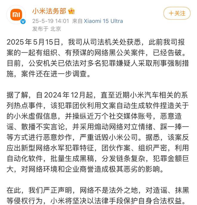 小米法务部发文称,2025年5月15日,从司法机关处获悉,此前我司报案的一起有组织、有预谋的网络黑公关案件,已经告破。目前,公安机关已依法对多名犯罪嫌疑人采取刑事强制措施,案件还在进一步调查。