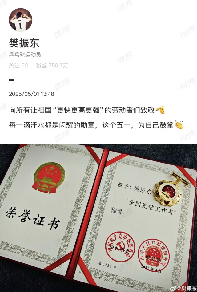 今年4月29日,《全国劳动模范和先进工作者名单》发布,樊振东获“全国先进工作者”称号。5月1日,他在微博中晒出荣誉证书:“这个五一,为自己鼓掌”。