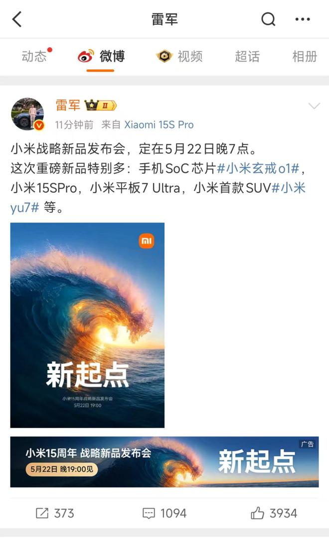 5月19日报道 近日,小米集团创始人、董事长兼CEO雷军通过微博宣布,小米15周年战略新品发布会将于5月22日举行。本次发布会将带来众多重磅新品,包括手机SoC芯片小米玄戒O1、小米15S Pro、小米平板7 Ultra以及小米首款SUV——小米YU7。其中小米首款智能汽车YU7有望在发布会上正式亮相,可能随后在成都车展上与公众见面。