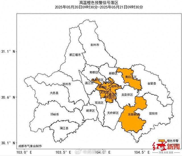 5月20日,红星新闻记者获悉,成都市气象台2025年5月20日9时30分发布高温橙色预警信号:预计武侯区、锦江区、青羊区、成华区、金牛区、高新南区、高新西区和青白江区的所有镇(街道)未来24小时内最高气温将升至35℃以上,东部新区的大部分镇(街道)未来24小时内最高气温将升至38℃以上。高温时段主要出现在今日13时至18时。请注意防范。据悉,这是今年首个高温预警信号。