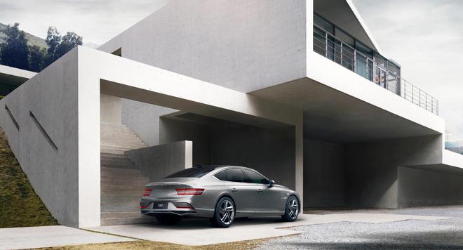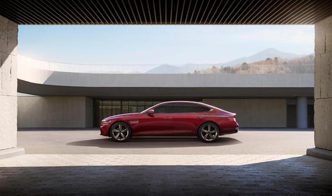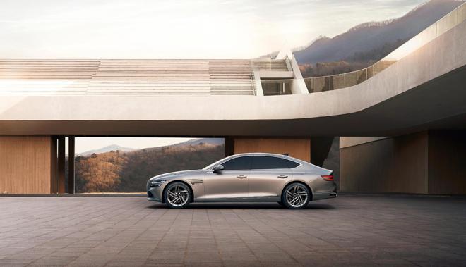 从侧面看,新款捷尼赛思G80的车身线条流畅而优雅,腰线从前翼子板一直延伸至车尾,营造出一种向前俯冲的视觉效果,彰显出车辆的运动气息。新车提供18、19、20英寸多款轮毂可供选择,满足了不同消费者的个性化需求,进一步提升了车辆的外观吸引力。