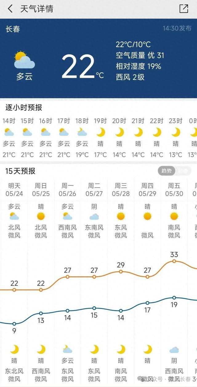 长春气象台5月23日下午发布短期天气预报,今天夜间,晴有时多云,榆树有小雨或雷阵雨,偏北风2-3级。明天白天,多云有时晴,偏北风2-3级。明天夜间到后天白天,晴。5月25日夜间到26日白天,晴。长春市区今天夜间最低气温: 10℃,明天白天最高气温: 22℃。