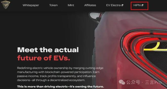 是这家公司的token页面,白话说就是发bi,还有白皮书。高合汽车HiPhi被堂而皇之挂在这个页面的右上角,链接到高合汽车官网。