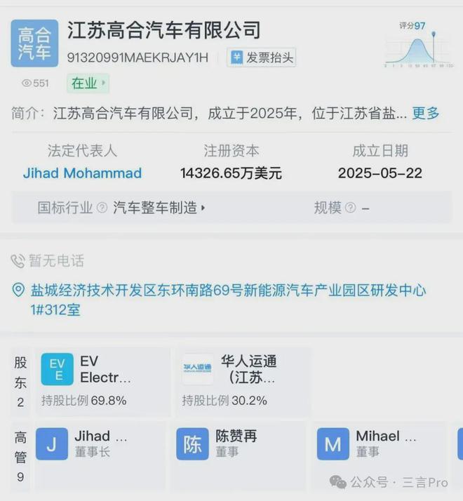 天眼查App显示,5月22日,江苏高合汽车有限公司成立,法定代表人和董事长为Jihad Mohammad,注册资本约1.43亿美元,经营范围包括道路机动车辆生产、汽车零部件研发、工程和技术研究和试验发展等,由EV Electra Ltd.和华人运通(江苏)技术有限公司共同持股。