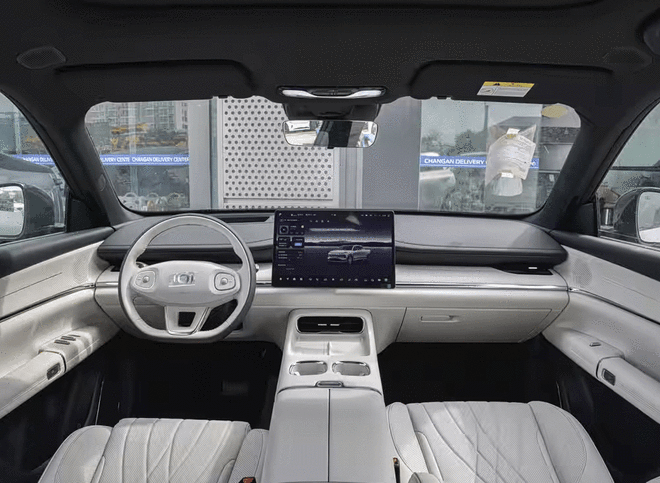 启源Q07的内饰采用了全新的设计风格,三辐式多功能方向盘搭配15.4英寸中控屏。中控屏可以根据使用者位置向左或是向右偏转15度。平直的中控台线条,搭配精致的内饰材质,营造出简洁时尚的视觉效果。