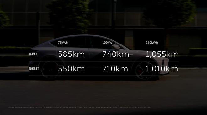 动力方面,该车延续了现款车型的水平,采用前感应异步后永磁同步电机的四驱组合,最大功率360kW,峰值扭矩700N·m。电池容量则有75kWh、100kWh和150kWh电池组,ET5的续航里程味585km、740km和1055km;ET5T续航里程550km、710km和1010km。