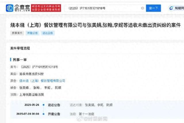 据媒体报道,企查查APP显示,5月26日,法院送达烧本烧(上海)餐饮管理有限公司与张翰等追收未缴出资纠纷一案开庭传票等,将于7月28日在上海铁路运输法院开庭审理。信息显示,该公司成立于2021年1月,注册资本1000万,张翰曾持股10%,并于2023年4月退出。
