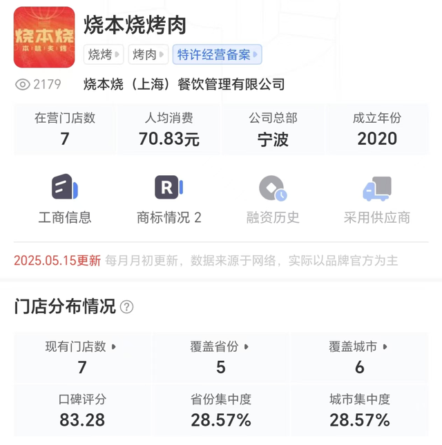 根据窄门餐眼数据,截至5月27日,仍有7家烧本烧烤肉门店在营,覆盖了5个省份、6座城市,大多聚集在低线城市。