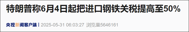 美国白宫当天在社交媒体上发布公告称,“为进一步保护美国钢铁行业免受外国和不公平竞争的影响,从下周起,美国进口钢铁关税将从25%提高至50%。”