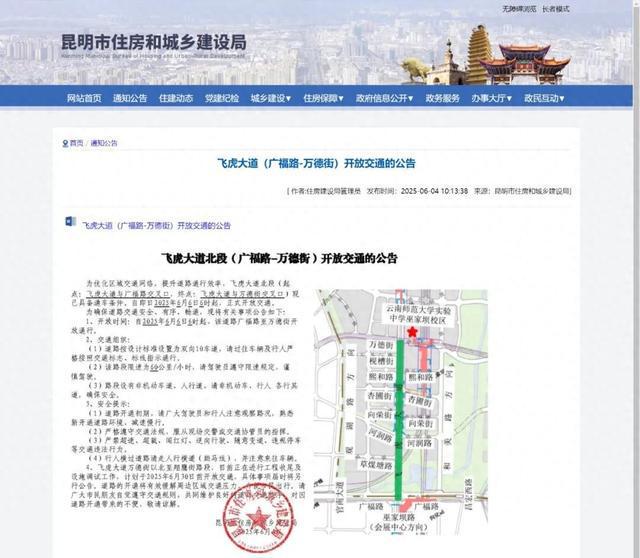 今日,昆明市住房和城乡建设局发布《飞虎大道北段(广福路—万德街)开放交通的公告》。