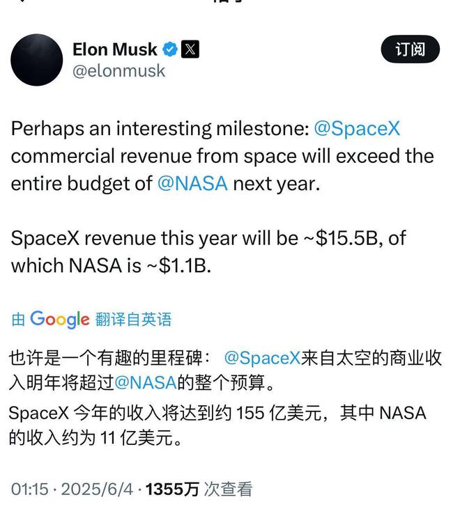 马斯克:SpaceX今年收入将有约155亿美元 访客 2025-06-04 16:13:26 80001 抢沙发 默认 今日,马斯克发文称SpaceX来自太空的商业收入明年将超过NASA的整个预算。SpaceX今年的收入将达到约155亿美元,其中NASA的收入约为11亿美元。 标签: 收入 美元 海报 阅读 QQ 分享 微博分享 微信分享 分享 上一篇雷军安排18元无门槛红包请奶茶?小米回应:假消息 下一篇蔚来5月新增换电站50座 雷军安排18元无门槛红包请奶茶?小米回应:假消息上一篇 蔚来5月新增换电站50座下一篇 相关推荐 收入美元 马斯克身家突破6000亿美元大关 2025-12-16 马斯克身家飙升至6770亿美元,距离万亿富翁仅一步之遥! 2025-12-16 Scale AI面临危机,143亿美元投资后的挑战 2025-12-12 美国知名机器人公司iRobot遭遇重大危机 2025-12-06 马斯克基金会四年未达标捐赠额曝光 2025-12-04 美团三季度业绩报告,营收达955亿元,亏损达160亿元 2025-11-30 搜狐公司第三季度总收入稳健增长,同比增长达19%至1.8亿美元 2025-11-17 黄仁勋完成年度减持计划,累计套现超十亿美元,年度减持成果揭晓 2025-11-02 发表评论取消回复 快捷回复: 评论列表 (暂无评论,80001人围观)参与讨论 还没有评论,来说两句吧...