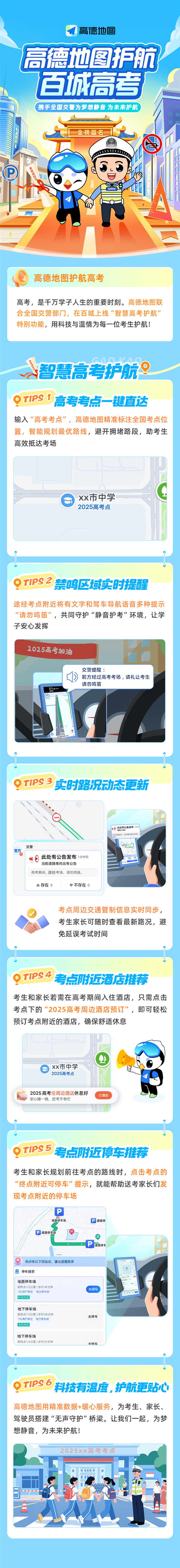 为此,高德地图联合全国交警部门,在百城上线"智慧高考护航"特别功能——高考考点一键直达。