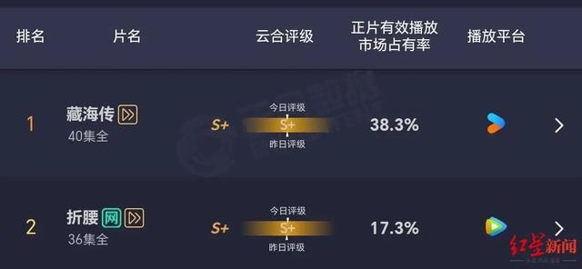 剧集在优酷播出后,热度迅速破万,打破平台纪录。云合数据显示,截至4日,《藏海传》正片有效播放市场占有率达38.3%。灯塔专业版数据表明,该剧集均播放量超4100万,远超第二名《折腰》2940万的集均播放量。中国视听大数据显示,该剧13-26集在央八播出时,收视率为1.447%,位居黄金档第二。