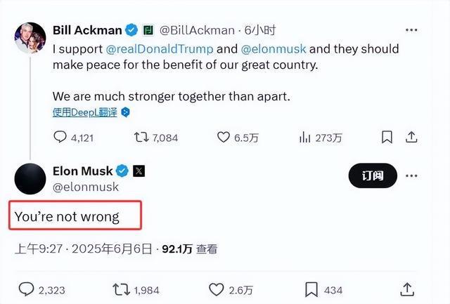 然而,种种迹象表示,马斯克似乎有些后悔了,在回复亿万富翁对冲基金经理比尔·阿克曼支持两人和解的帖子时,他说:“你说得没错。”