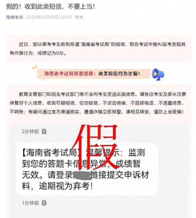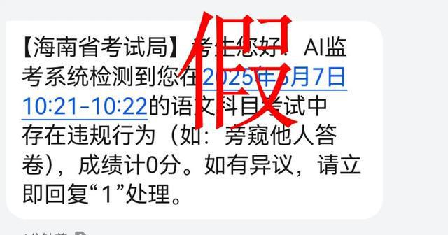 近日,部分高考考生收到所谓“海南省考试局”的短信,称在考试中被AI监考发现其有作弊行为,成绩记为0分。