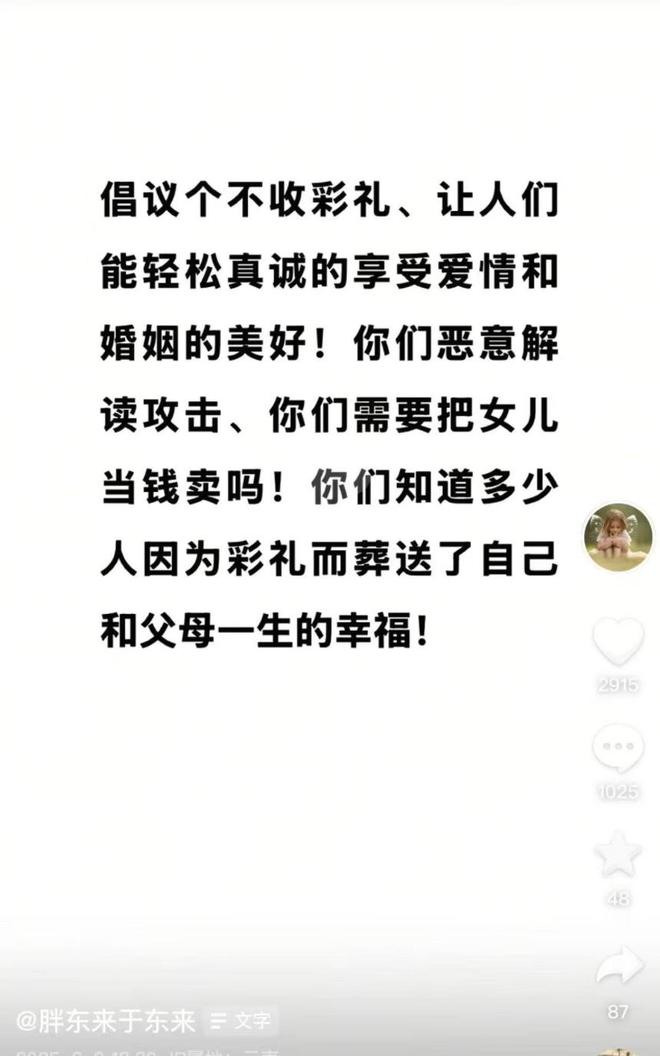 他表示,“倡议个不收彩礼、让人们能轻松真诚的享受爱情和婚姻的美好!你们恶意解读攻击、你们需要把女儿当钱卖吗!你们知道多少人因为彩礼而葬送了自己和父母一生的幸福!”