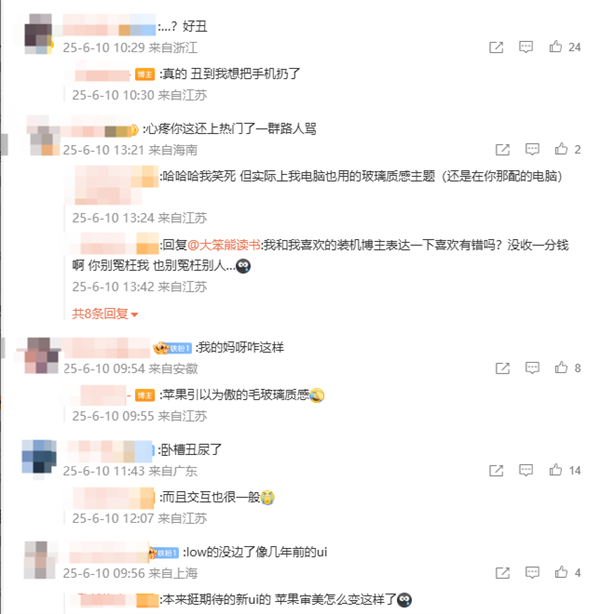 网友还表示:"本来挺期待新UI的,结果方面苹果的审美变成这样了。"