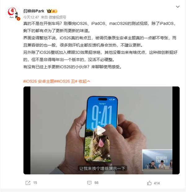 此外,也有知名博主发微博评价iOS 26:真的不是在开倒车吗?